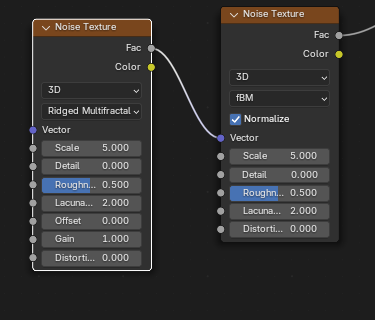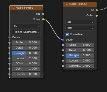 ![]() | ![]() | Noise Texture Ridged Multifractal Fac into Noise Texture fBM Vector. |