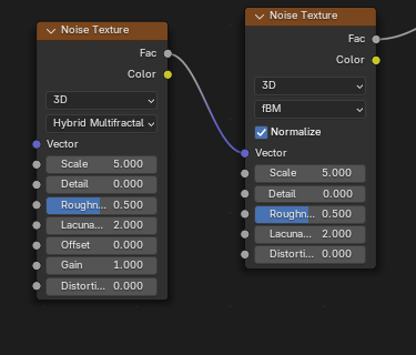 Musgrave texture generated from fBM Noise texture with parameters: Scale: 5.0, Detail 15.0, Roughness 0.7, Lacunarity 2.0, Offset 0.0. Distortion 0.0.