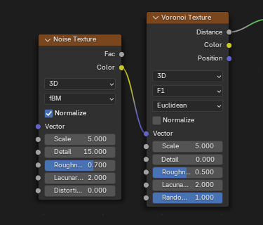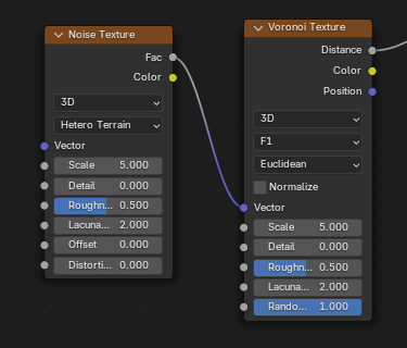 Voronoi textures use the standard parameters: Scale 5.0, Detail 0.0, Roughness 0.5, Lacunarity 2.0, Offset 0.0. Randomness 1.0. Refer to previous section for screenshots.