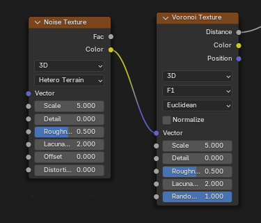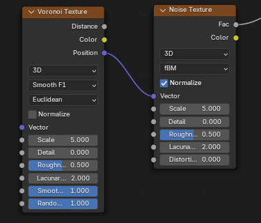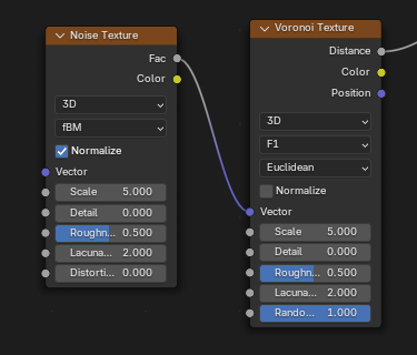![]() | ![]() | Noise Texture fBM Fac into Voronoi F1 Vector. |
