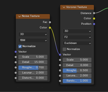 For Voronoi texture: Scale 5.0, Detail 0.0, Roughness 0.5, Lacunarity 2.0, Offset 0.0. Randomness 1.0.